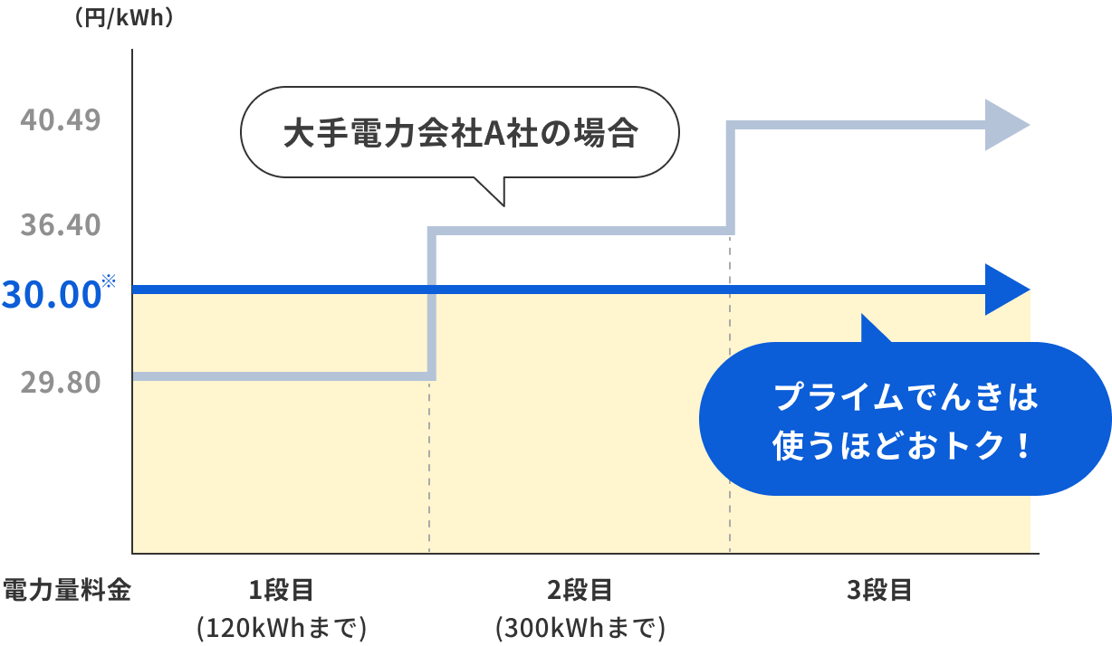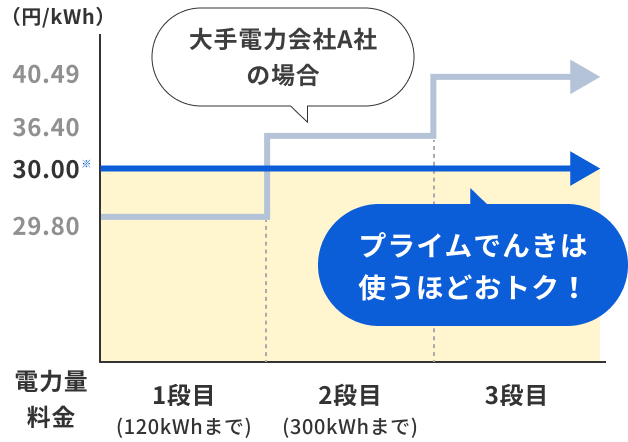多くの電力会社が採用している従量電灯プランでは、電気の使用量が増えるにつれて、1段階、2段階、3段階と電力量料金単価が上がる仕組みになっています。 一方、「プライムでんき」は使用量にかかわらず電力量料金単価が一律のため、使えば使うほどお得になるプランです。